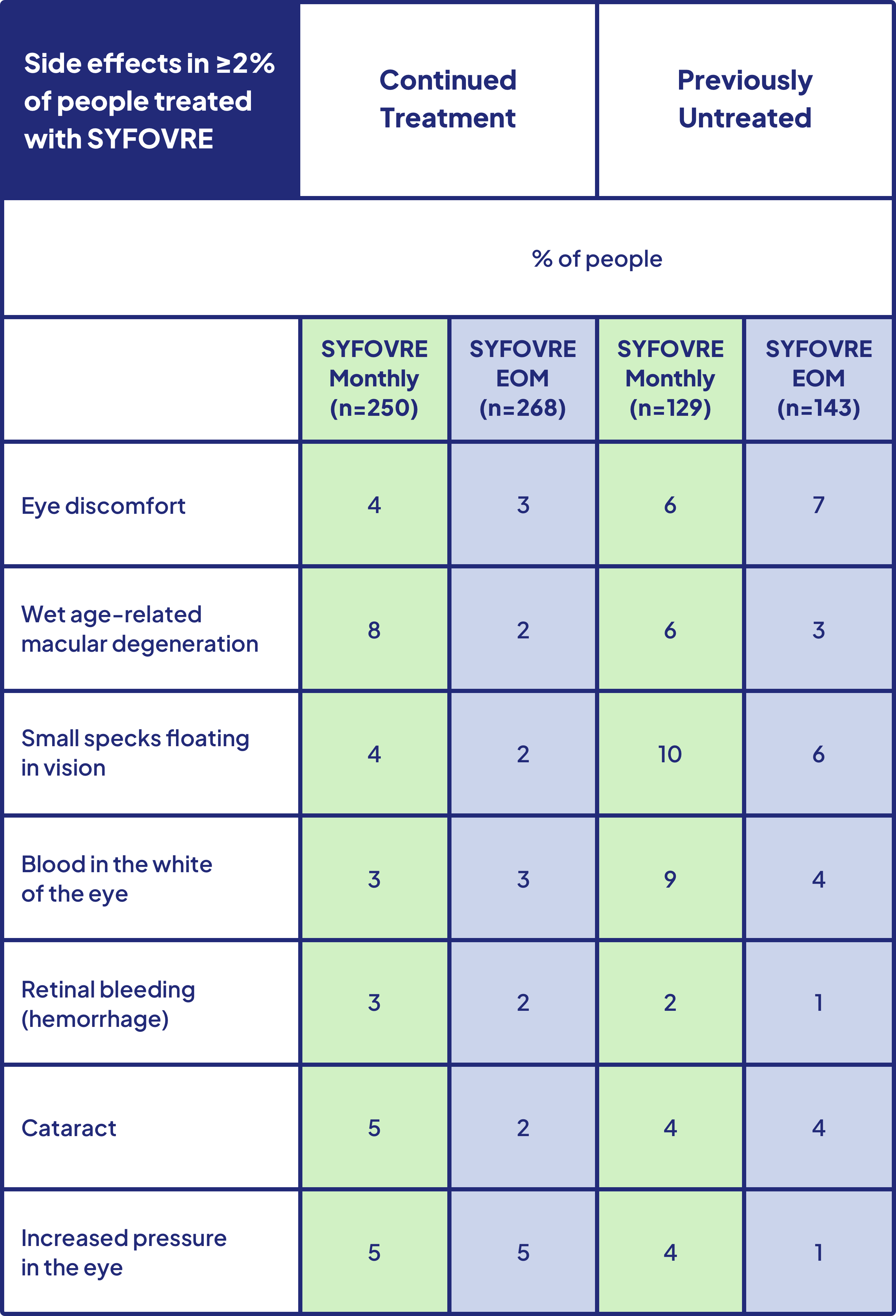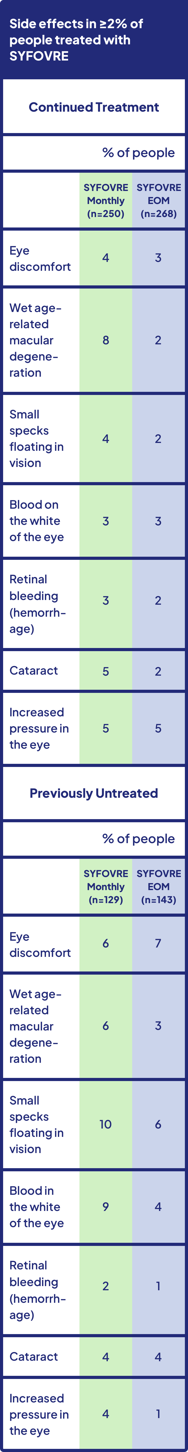 These are not all the possible side effects of SYFOVRE. Tell your healthcare provider about any side effect that bothers you or does not go away.